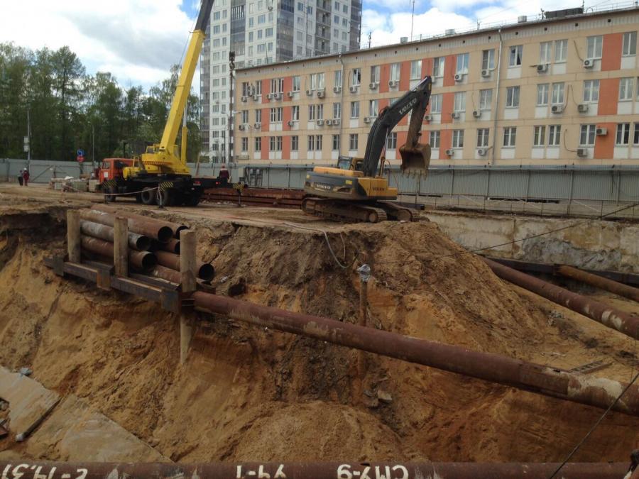 На строительной площадке Клубного Дома "Октябрь" ведутся земляные работы, демонтаж монолитной технологической дороги и форшахты. Продолжаются работы в котловане.