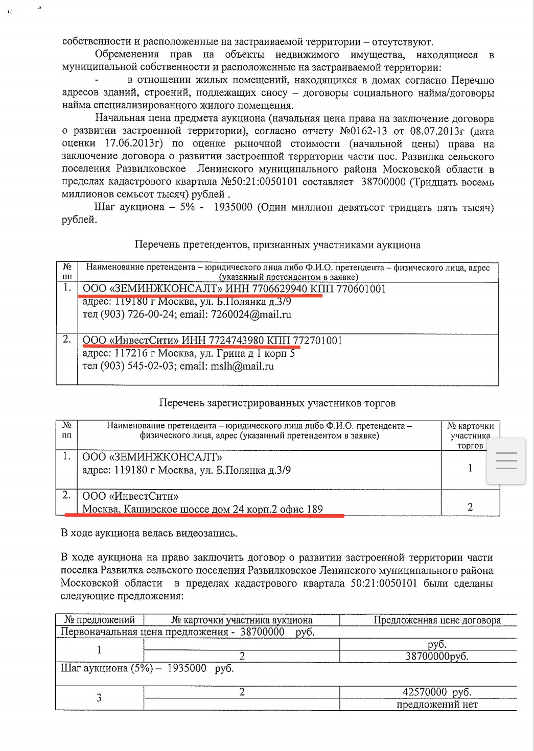 В аукционе принимали участия две аффилированные компании ООО ИнвестСити и ООО Земинжконсалт ( бенефициаром которых является Туровский Олег Аркадьевич)..