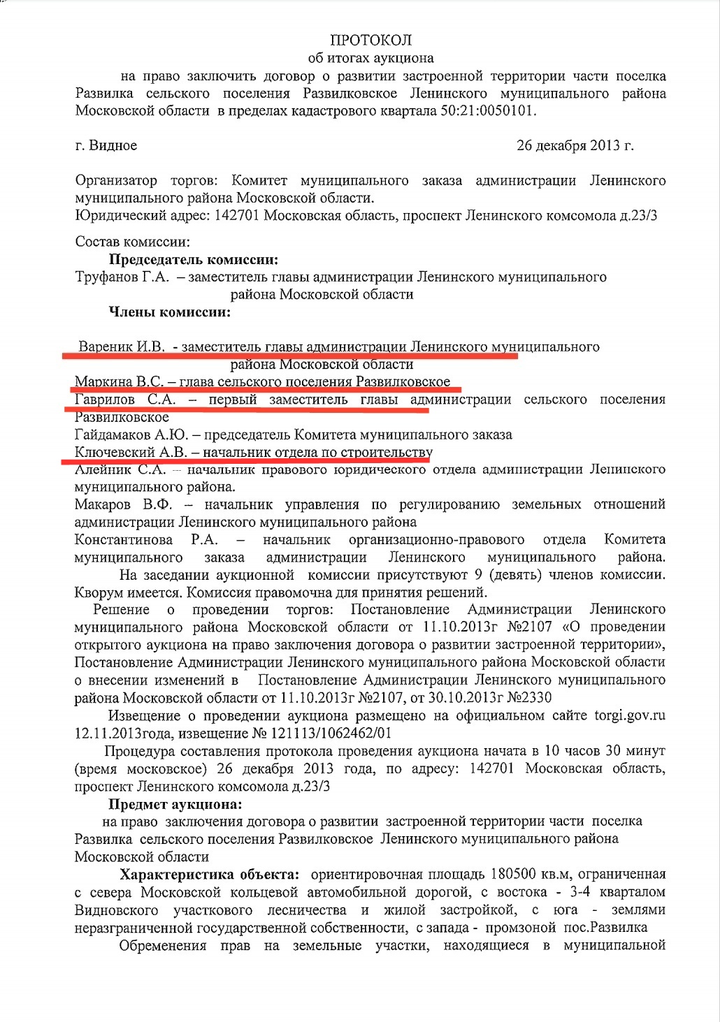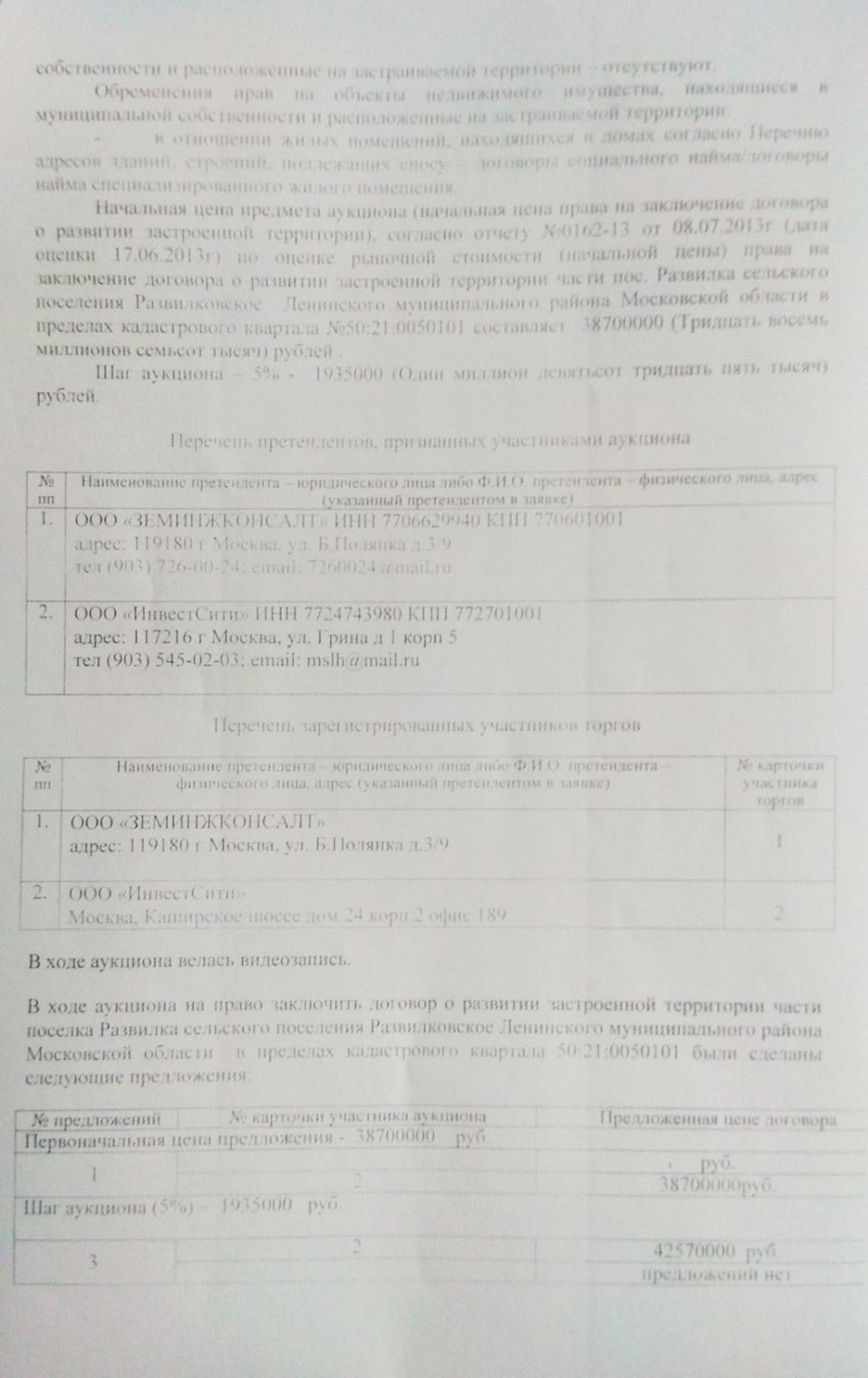 Администрация Ленинского района Московской области в 2013 году провела открытый аукцион, на право заключить договор о застроенной территории в поселке Развилка, в котором другие участники не допускались...