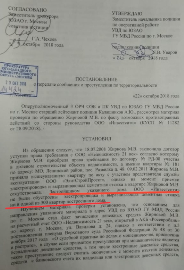 Важное обстоятельство, руководство ИнвестСити обманула дольщиков ЖК Сходня Парк! По факту хищения денежных средств возбуждено уголовное дело по ч.4 ст.159 УК РФ.