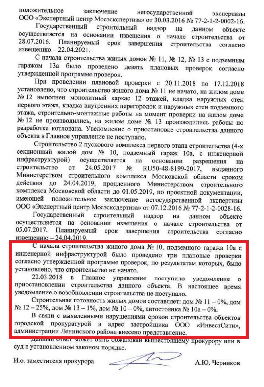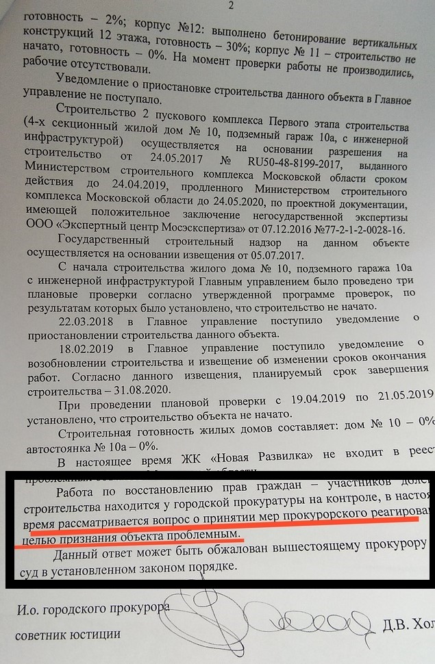Прокурор очень долго рассматривает вопрос о признания ЖК Новая Развилка проблемным объектом, думаю отрабатывает взятку от застройщика !!!!!!! Стройка 10, 11, 13 корпуса СТОИТ почти ЧЕТЫРЕ ГОДА дольщики заплатили за квартиры в 2016 году, по договору сдача корпусов должна была в сентябре и в декабре 2019 года. Застройщик не начинает строить дома почти четыре года. Администрация и прокуратура БЕЗДЕЙСТВУЕТ!!!!!!
