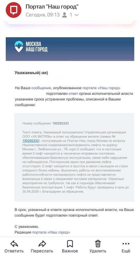 УК и портал настойчиво утверждают, что у них есть 4 лифта: 2 из них в рабочем состоянии, а 2 — нет. На деле же работает только один пассажирский лифт, который, как оказывается, тоже часто застревает. В доме проходит ОСС о смене управляющей компании, но инициативная группа жильцов боится, что в случае смены они могут остаться без лифтов вовсе. Жители фактически оказались в заложниках: управляющая компания использует их страхи, чтобы избежать ремонта. Сроки восстановления лифтов постоянно откладываются.