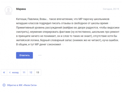 Еще я заметила, что боты любят указывать на ошибки в тексте людей, возражающих им. Вот пример с ЖК Фили Сити