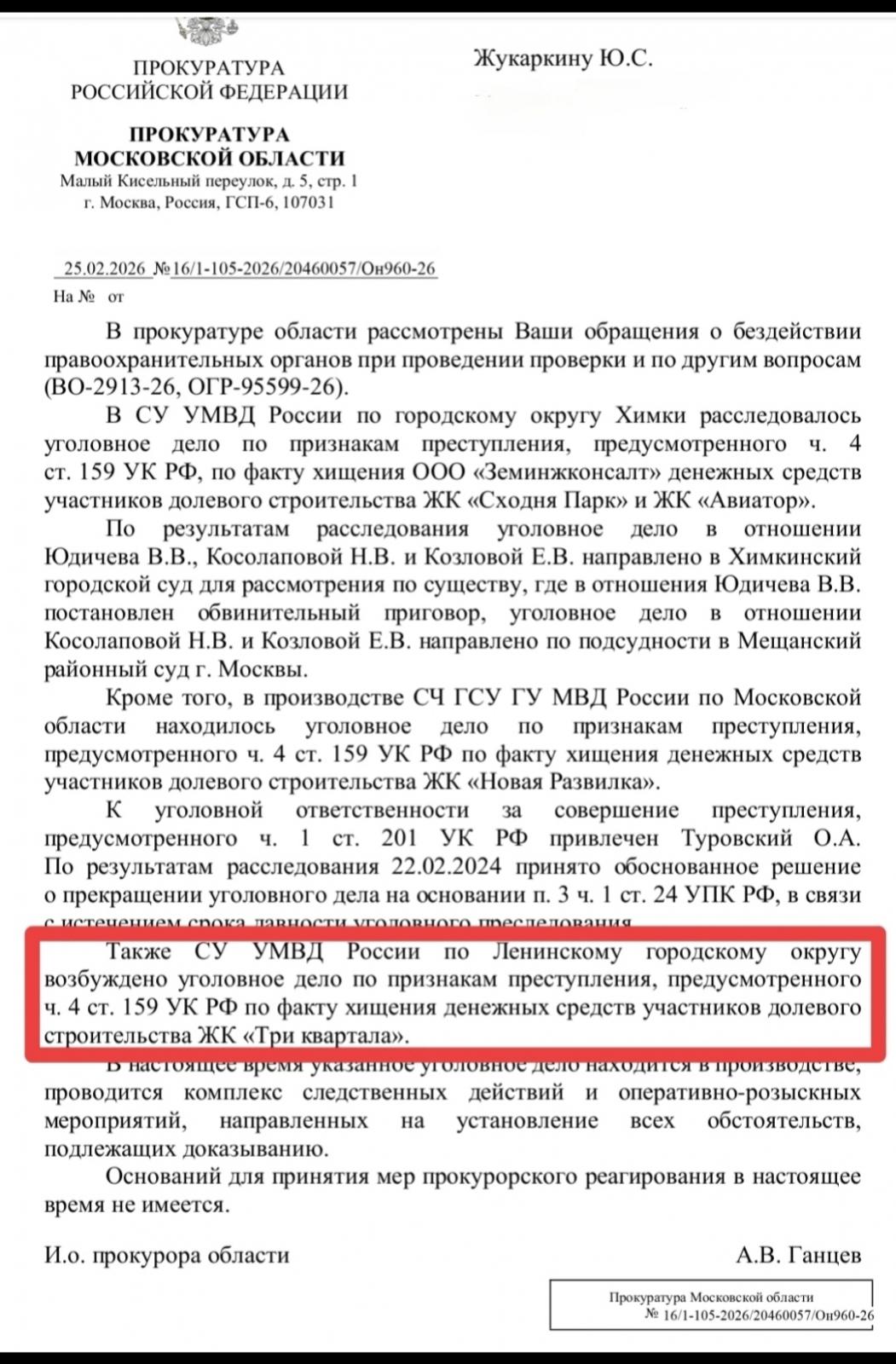 и. о.прокурора Московской области А. В. Ганцев ответил.