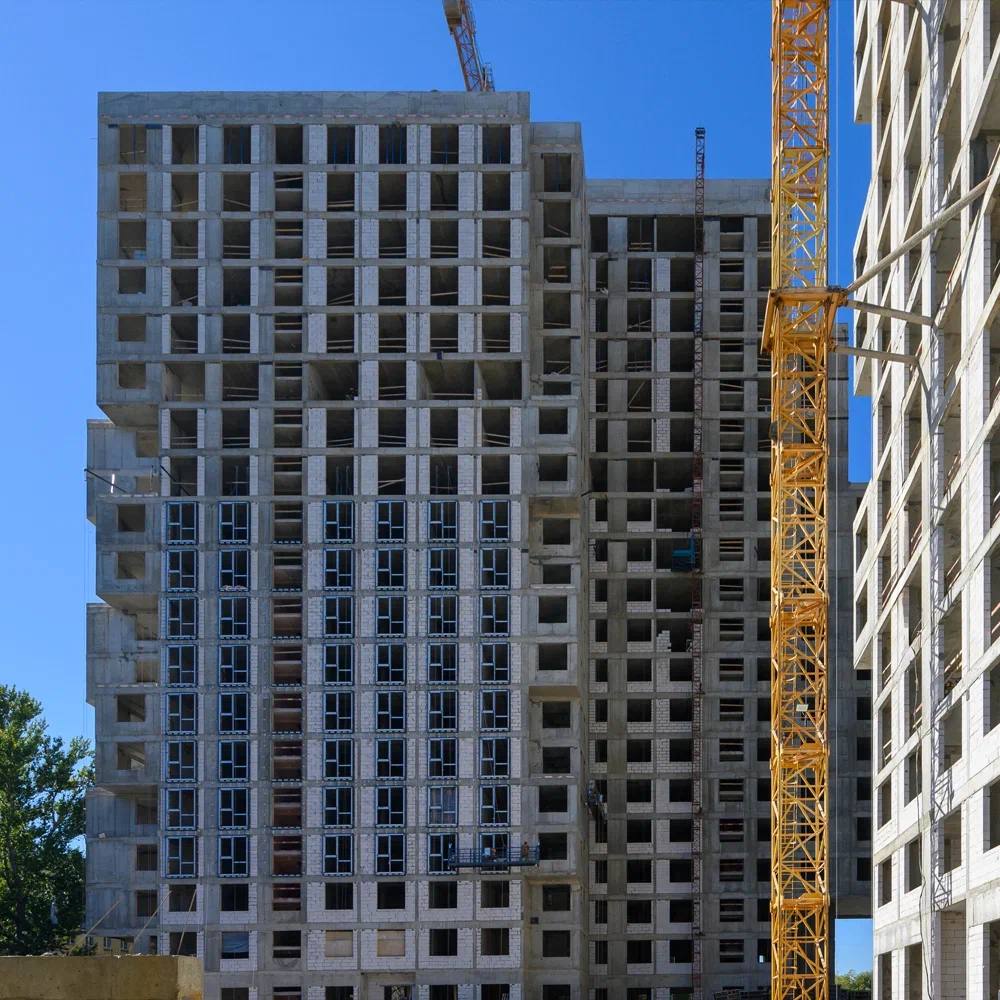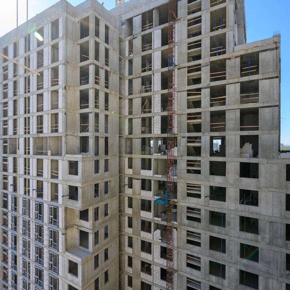 На сегодняшний день общая готовность монолитного каркаса комплекса составляет 98%. В обеих секциях работы ведутся на уровне последнего, 20-го, этажа. Так, в первой секции уже началось устройство плиты покрытия и парапетного ограждения кровли. Во второй секции выполняется армирование и бетонирование вертикальных конструкций 20-го этажа.