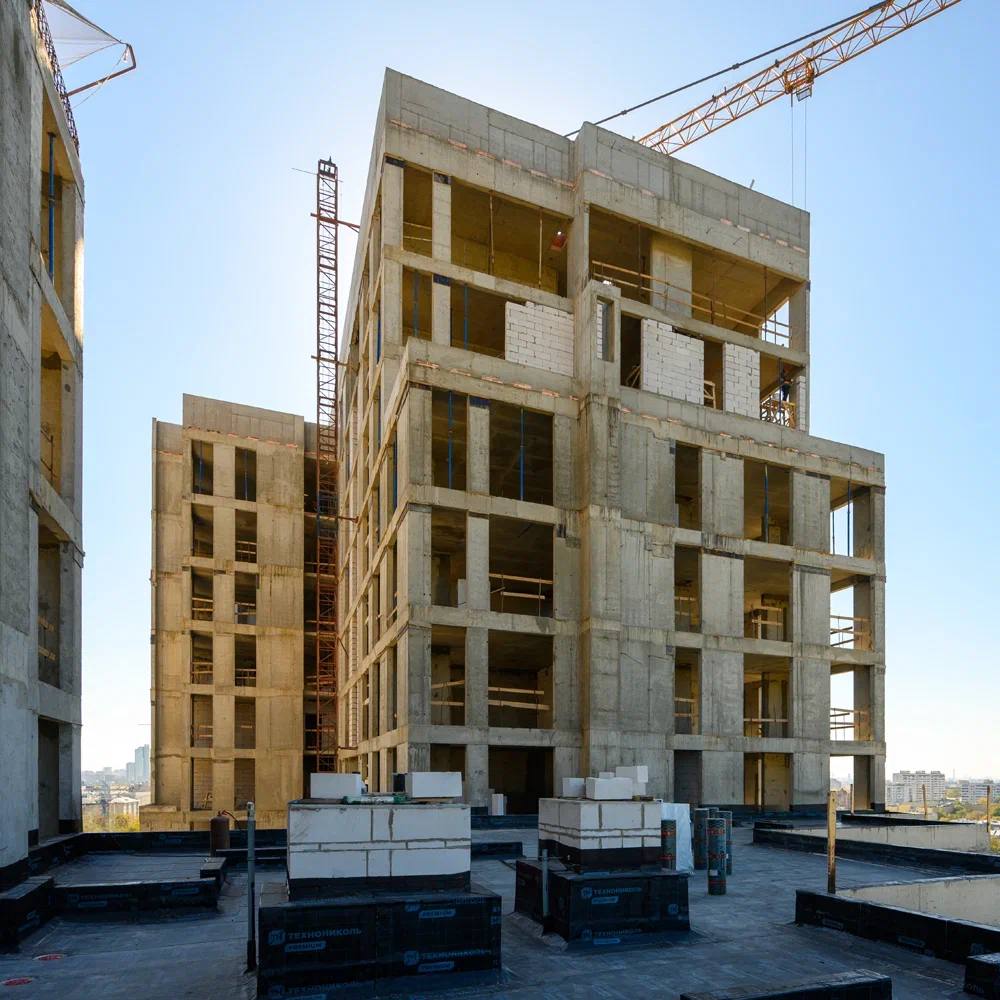 В начале сентября в комплексе завершаются монолитные работы в обеих секциях. Параллельно здесь выполняется кладка стен. Помимо этого, строители приступили к новым важнейшим этапам работ: устройству фасадов и монтажу внутренних инженерных коммуникаций.