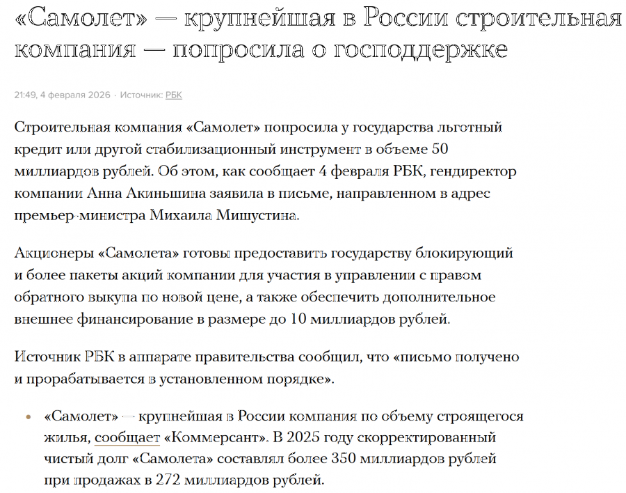 Да снимите вы розовые очки, уже почти год говорят, что у Самолета проблемы. То они объекты продают, то их главный акционер пытается избавиться от своих активов, потом он умирает и теперь начались обыски, массовые сокращения рабочих и уголовные дела. Что дальше? А дальше, либо компанию скинут другому застрою, либо банкротство.