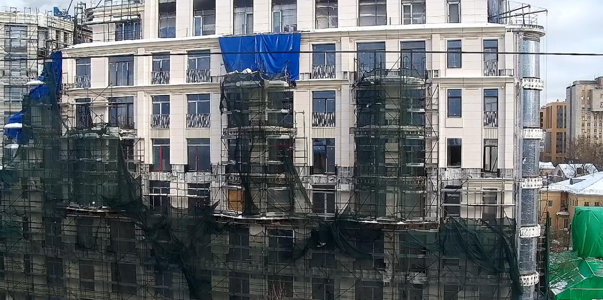 Продолжаются фасадные работы. Завершаем установку кронштейнов — 97% и монтаж утеплителя — 87%. Монтируем вентилируемый фасад — 59% и натуральный камень — 60%. Продвигаются работы по остеклению — 78%.
