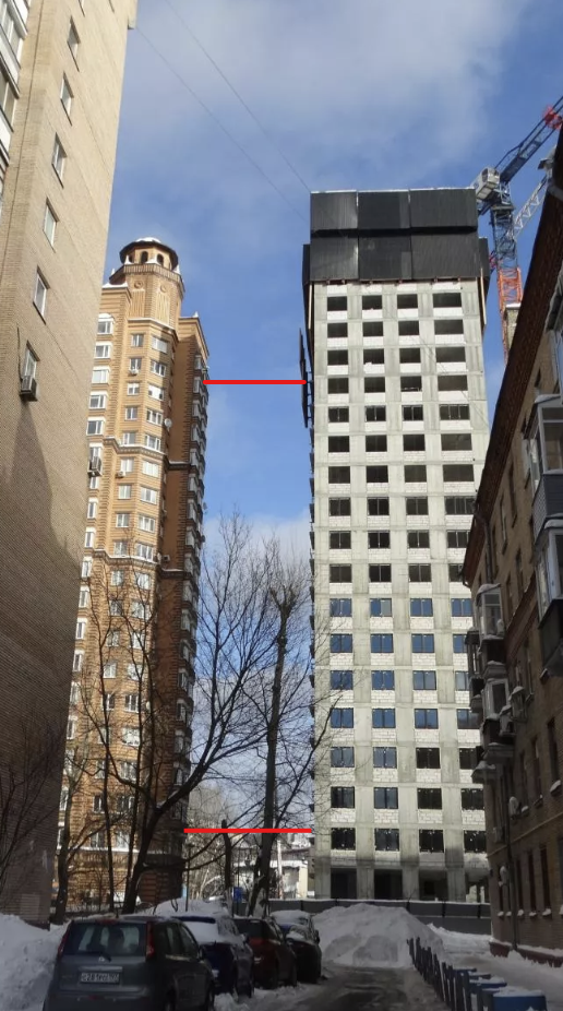 Может, кто то прокомментировать такой момент. Глядя на фото, создается такое впечатление, что корпус построен с наклоном. Смотрим на расстояние между домами снизу и сверху. Внизу расстояние явно больше.