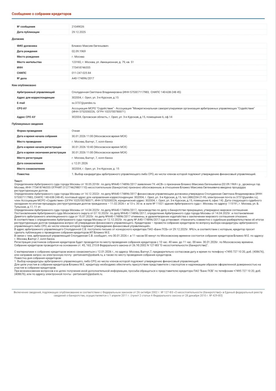 от 07.10.2025г. (вступило в силу 07.10.2025г.) отказано в удовлетворении ходатайства Блажко о заключении мирового соглашения с кредиторами.