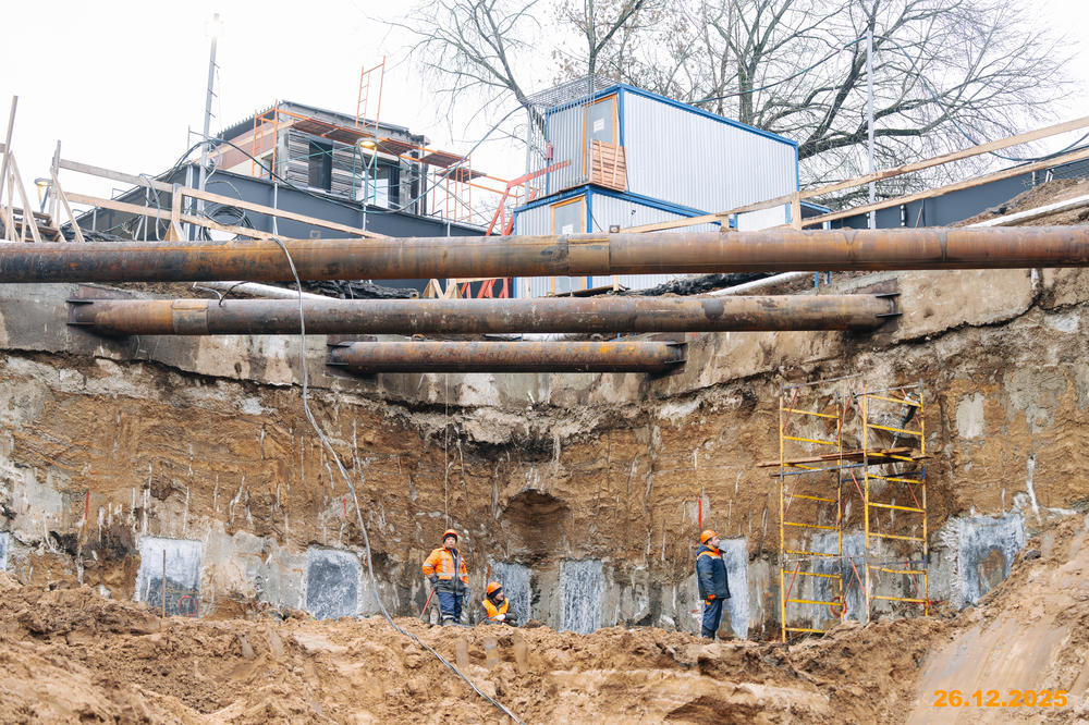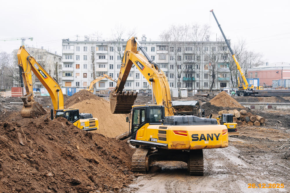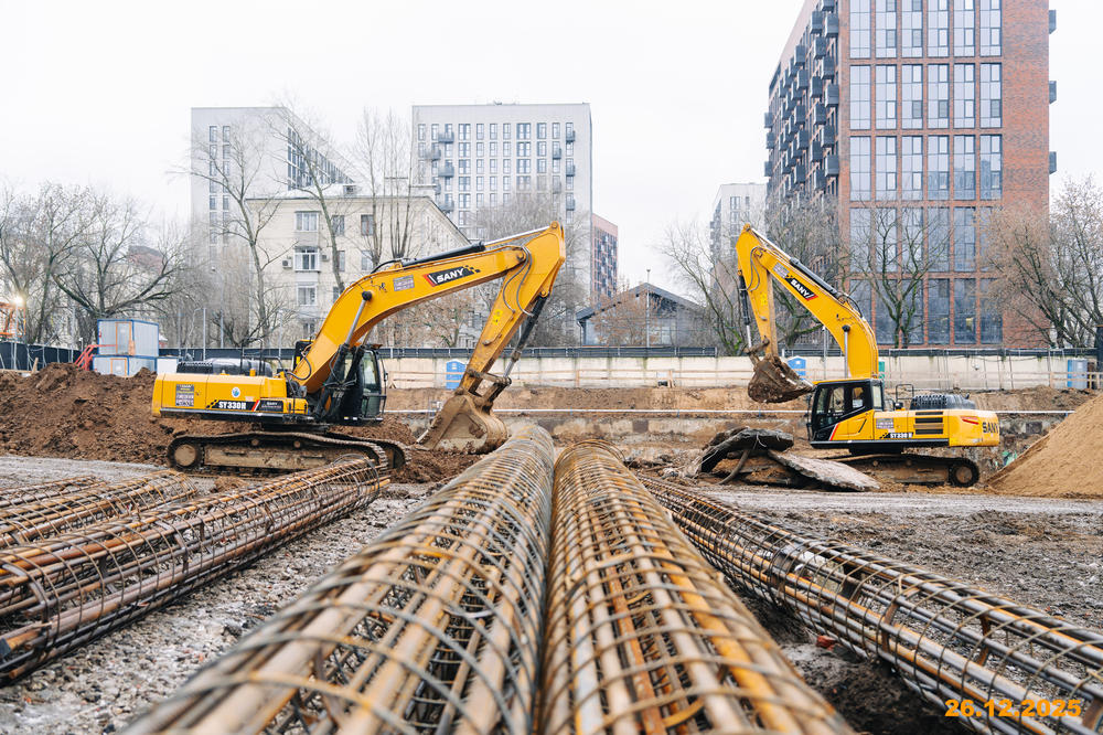 да работы ведутся, до сих пор вывозят грунт из котлована под фундамент, забивают сваи, бурят отверстия для труб инженерии и канализации. Вроде работают, но как-то не по пиковски. Медленно