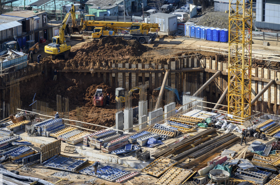 Уже от апреля выставили фотоотчет. Видно, что и техника работает и строителей на стройке, как мурашей.