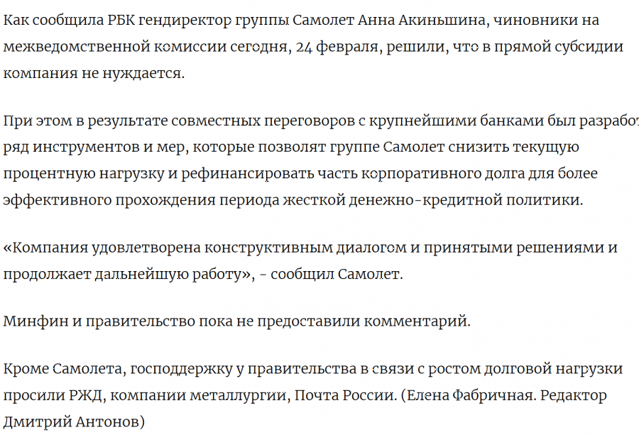 К тому же Минфин опроверг, что Самолет информацию о том, что Самолет несет финансовые риски. Так что можно выдохнуть, все будет хорошо.