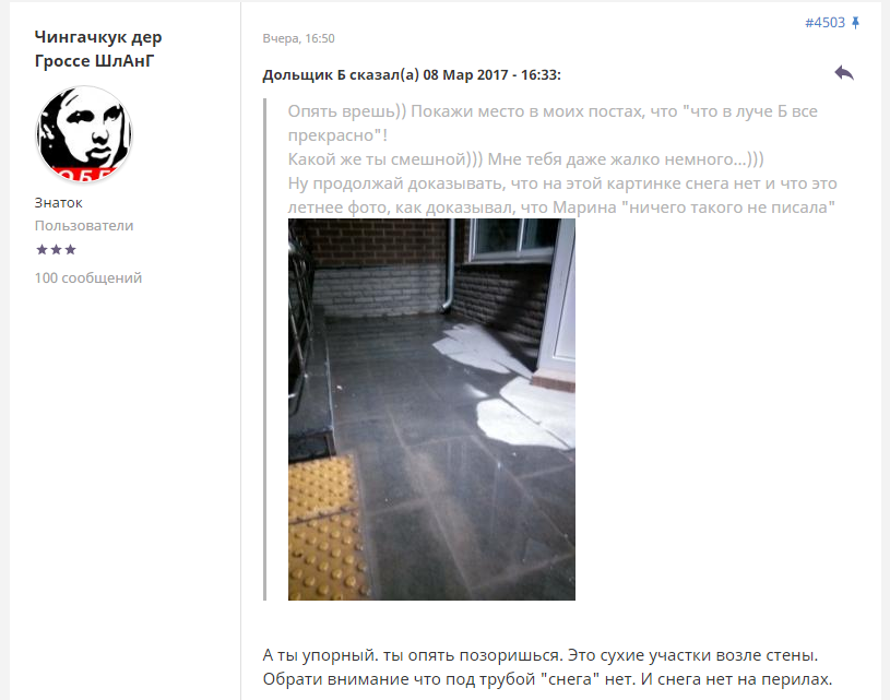 Мисс Полина, это даже для Вас, перебор. Все уже признали, даже тролли, типа Чингачкука и Матео, что Марина выкладывала фотки МОПов Луча А вместо Б. Не надо так врать, Вам и так никто не верит, а Вы усугубляете)))) А какое Ваше мнение по поводу фотографии со снегом? Вы тоже считаете, как и Чингачкук с Матео, что это не снег, а сухие места у стены?)))